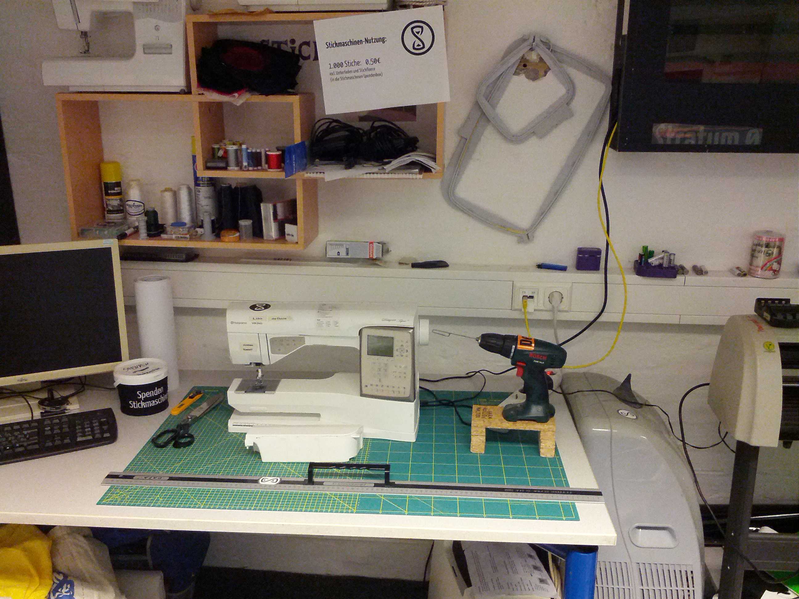 Die Stickmaschine ist repariert worden und ist jetzt wieder einsatzfähig. Von den Spenden in der Stickmaschinenbox wurde mehr Zubehör angeschafft, unter anderem befinden sich in der Stickecke jetzt eine Schneiderschere, sowie eine Schneidmatte, Lineal und Rollschneider zum Zuschneiden von Stoffen. Die Stickrahmen haben einen Haken in der Wand zum Aufhängen erhalten.
